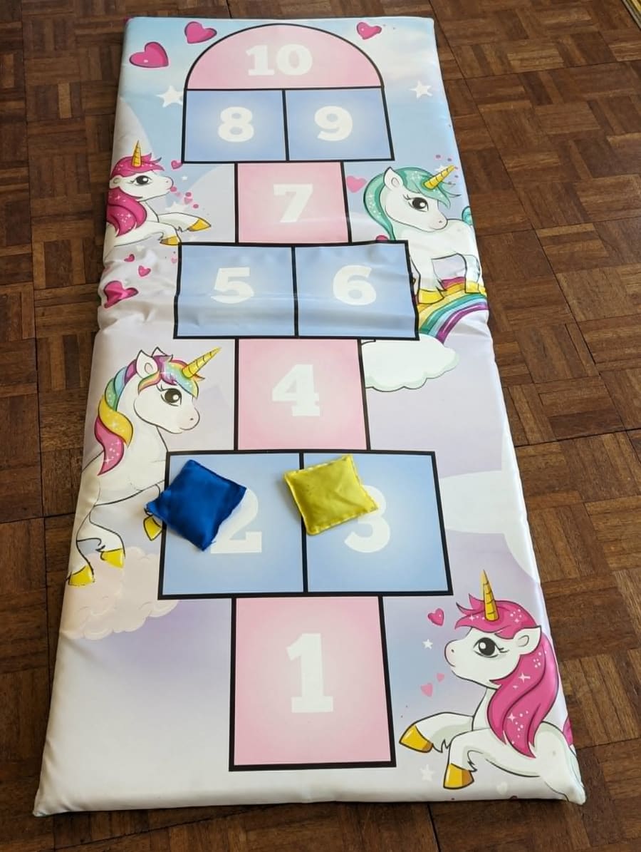 Unicorn Hopscotch is a soft play game that combines the classic hopscotch game with a whimsical unicorn twist. It features a colorful and vibrant hopscotch mat adorned with adorable unicorn illustrations. ๐จโจ